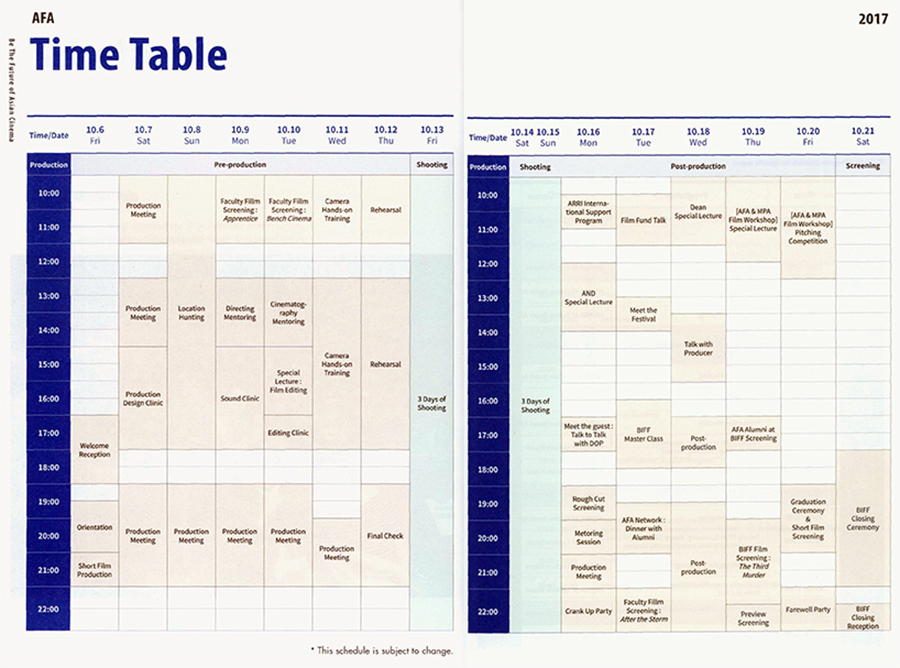 هر ساله، آکادمی فیلم آسیا برنامهای را در شهر بوسان برگزار میکند که از 6 اکتبر رسما شروع به کار میکند و در 21 اکتبر ، یعنی یک روز مانده به اختتامیه جشنواره بوسان ، کارش را به اتمام میرساند.