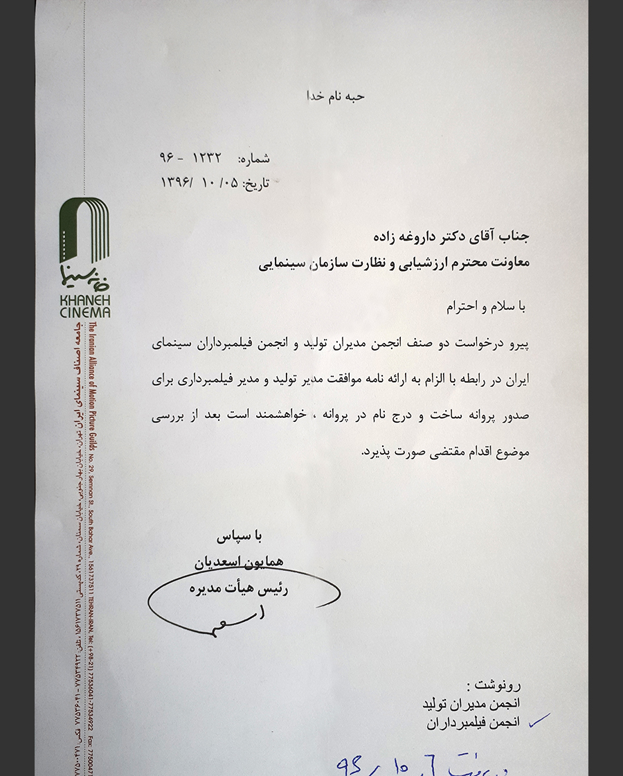 پیرو درخواست دو صنف انجمن مدیران تولید و انجمن فیلمبرداران سینمای ایران در رابطه با الزام به ارائه نامه موافقت مدیر تولید و مدیر فیلمبرداری برای صدور پروانه ساخت و درج نام در پروانه ، خواهشمند است بعد از بررسی موضوع اقدام مقتضی صورت پذیرد.